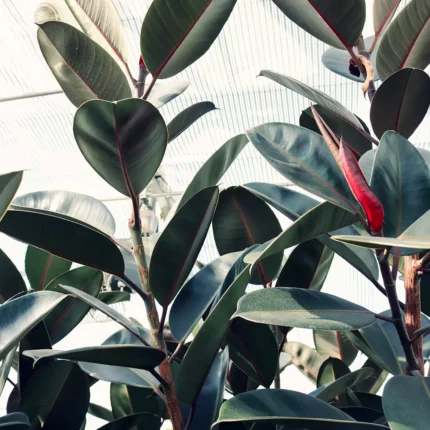 El Ficus elastica es una planta de interior muy resistente y decorativa, valorada por sus hojas grandes, brillantes y coriáceas de un verde profundo.